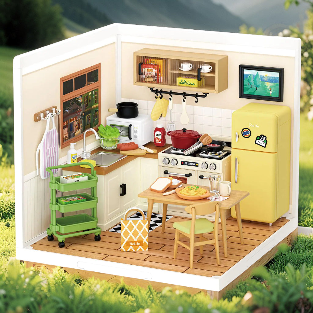 Get ready for a truly enjoyable project. Made from 152 high-quality plastic pieces, this kit snaps together smoothly—no glue is required! It's a clean, satisfying, and relaxing build for creators of all skill levels. Follow the colorful instructions and watch your dream kitchen come to life, from the fully stocked cabinets to the tiny rolling cart.